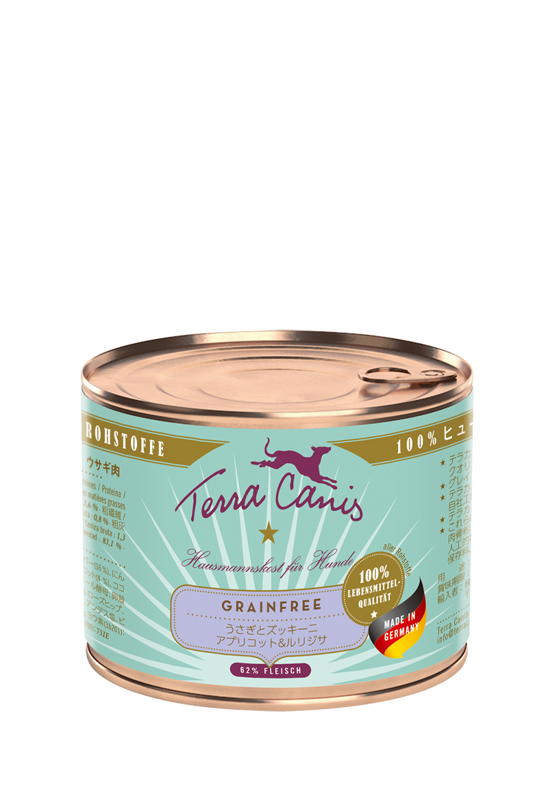 穀物や乳製品の食物アレルギーや消化吸収に配慮したメニューです。ウサギ肉・野菜・果物など愛犬の健康維持に必要なバランスの取れた手作り食の理想形を便利な1缶にしました。