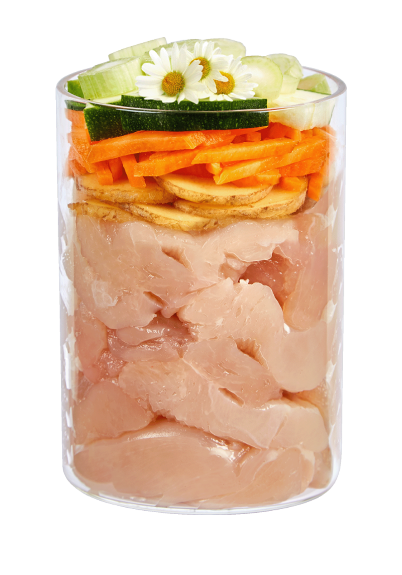鶏の筋肉(30%)、鶏の胃袋 (26%)、人参、ジャガイモ、ズッキーニ(7%)、フェンネル(3.5%)、セロリ、イチゴ(2%)、ブルーベリー、ココナッツ粉(1%)、亜麻仁油、MCTオイル、オイスターシェル*、ミネラルアース*、カモミール*(0.5%)、サイリウムハスク(オオバコの殻)*、亜麻仁、キャラウェイ*、ヤロウ*、イチョウ*、Emiko® EM-ブレンド(0.2%)、セイボリー*、アニス*、海藻*、ビタミン(A、D3、E、B1、B2、B6、B12)、ビオチン、パントテン酸、葉酸、ナイアシン、鉄、銅、マンガン、ヨウ素、亜鉛、カルシウム、リン、マグネシウム、塩化ナトリウム 、カリウム